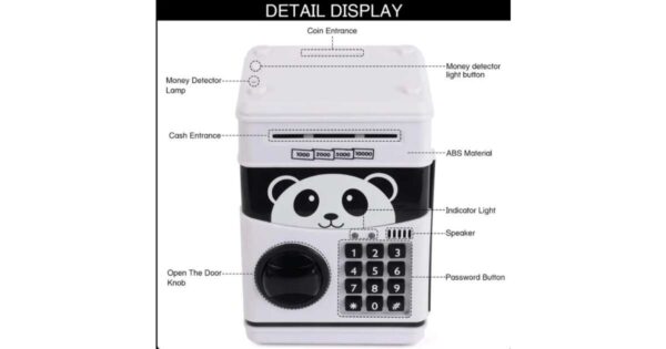Detalii produs: • Datorita acestei pusculite tip seif, veti strange banii intr-un mod avansat, securizat si distractiv; • Are o parola electronica pentru blocare si protectie; • Ajuta la dezvoltarea bunelor obiceiuri financiare ale celor mici. Mod utilizare: Parola standard pentru deschiderea pusculitei ATM, este 0000, daca doriti schimbarea parolei, tineti apasata tasta * pana se va aprinde ledul de culoare verde, introduceti noua parola si confirmati prin apasarea tastei #. Resetare parola • Metoda 1: Indepartati bateriile si asteptati timp de 5 minute pentru resetare, astfel parola se va resetarea default 0000. • Metoda 2: Tineti apasata tasta # timp de 10 secunde, ledurile rosu si verde vor indica resetarea parolei. Functii si specificatii: • Pusculita dispune de orificii separate pentru introducerea monedelor si a bancnotelor; • Functie automata de retragere a bancnotelor, ledul verde va indica functionarea normala iar ledul rosu indica o eroare sau blocarea bancnotelor; • Functie interactiva sonora la introducerea bancnotelor; • Functie de verificare a bancnotelor prin lumina UV; • Pusculita ATM functioneaza cu 3 baterii AAA (neincluse).